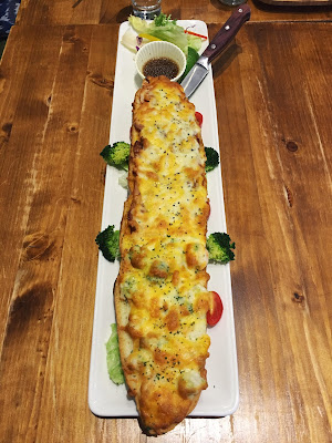 是以法國麵包作基底,應該是中間挖空加入了醬料