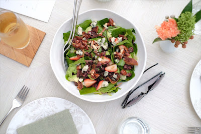 新鮮蔬菜搭配微酸的草莓、硬硬脆脆的培根、醃漬紅洋蔥、糖漬杏仁和藍乳酪