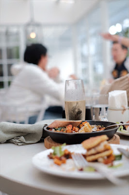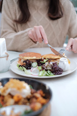 與三五好友一起分食鬆餅或沙拉、一起談笑著