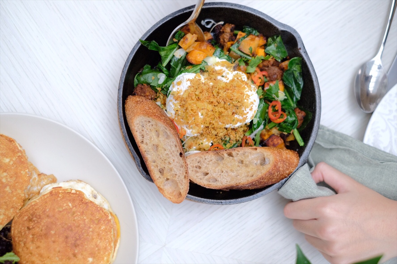 有西班牙臘腸、地瓜薯塊、焦糖洋蔥、兩顆半熟蛋、迷迭香麵包脆片、醃漬辣椒及酸種麵包