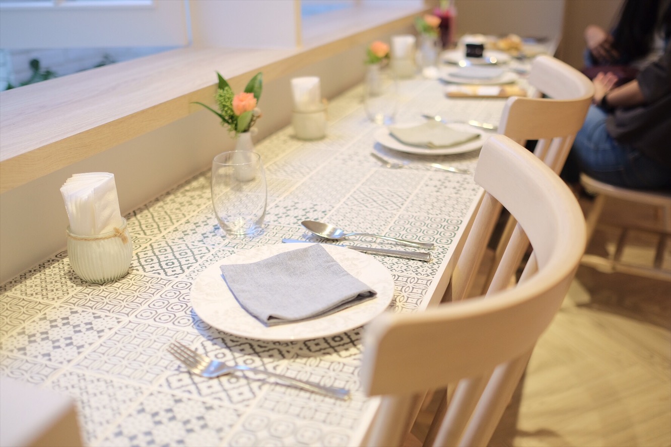 也有這種靠著牆面的吧台式座位,即便一個人用餐也能很享受