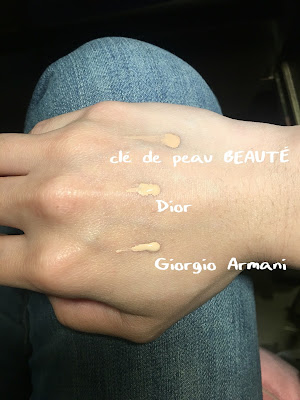 在妝效的部份,Giorgio Armani的粉底推開後就是比較霧面,粉感會比較重一些;而肌膚之鑰的則比較水潤,是輕潤透亮水煮蛋肌的感覺;Dior的就比較中規中矩,表限界於兩者之間,很適合再搭配有珠光的蜜粉來提亮膚色,基本上就看想要怎麼樣的妝容去做搭配摟!