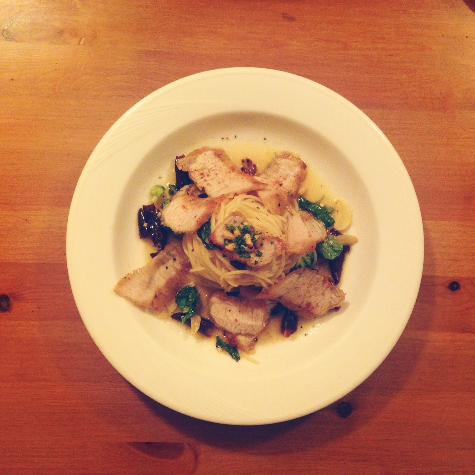 切得薄薄的、慢火煎得酥脆的松坂豬,搭配著是蒜味椒香義大利麵