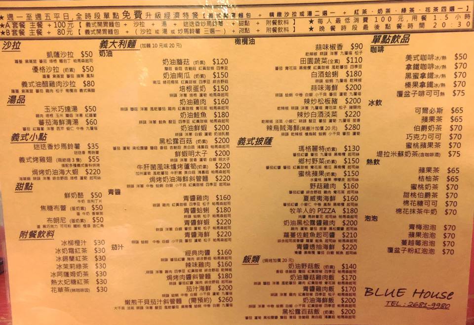 更新了一些資訊,把一週一次的飲食小麥的機會就放在BLUE HOUSE,還是可以看得出我的他的愛。雖然我最近常吃的已經從百菇義大利麵變成青醬雞肉飯。
