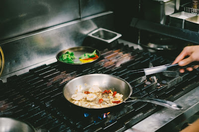 等油熱了,放入食材爆香,在鍋子內啪茲啪茲的,感覺現在都還能想到那微焦蒜片和辣椒的香氣;之後放入義大利麵拌炒、調味、灑上香料