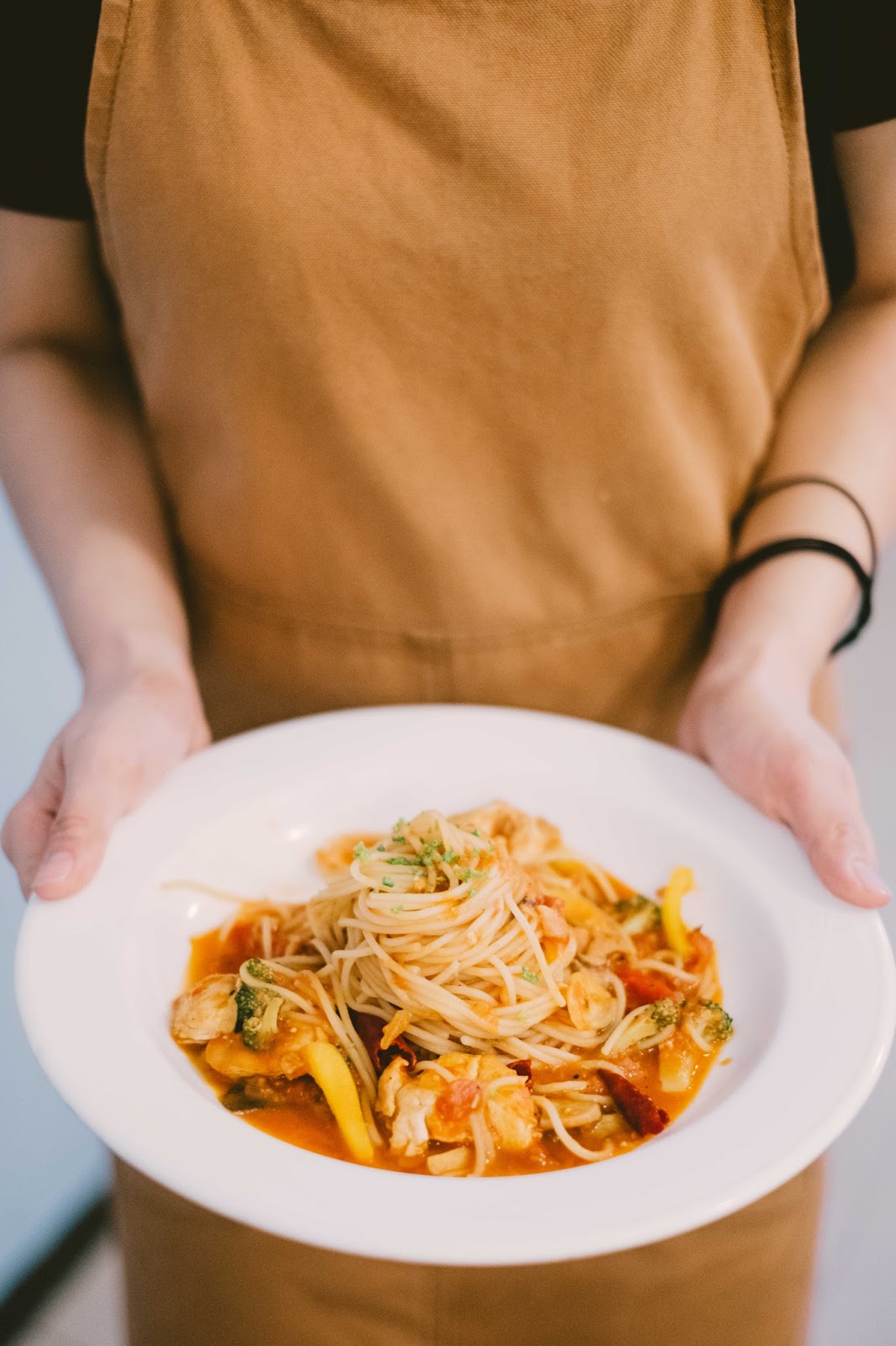 等油熱了,放入食材爆香,在鍋子內啪茲啪茲的,感覺現在都還能想到那微焦蒜片和辣椒的香氣;之後放入義大利麵拌炒、調味、灑上香料