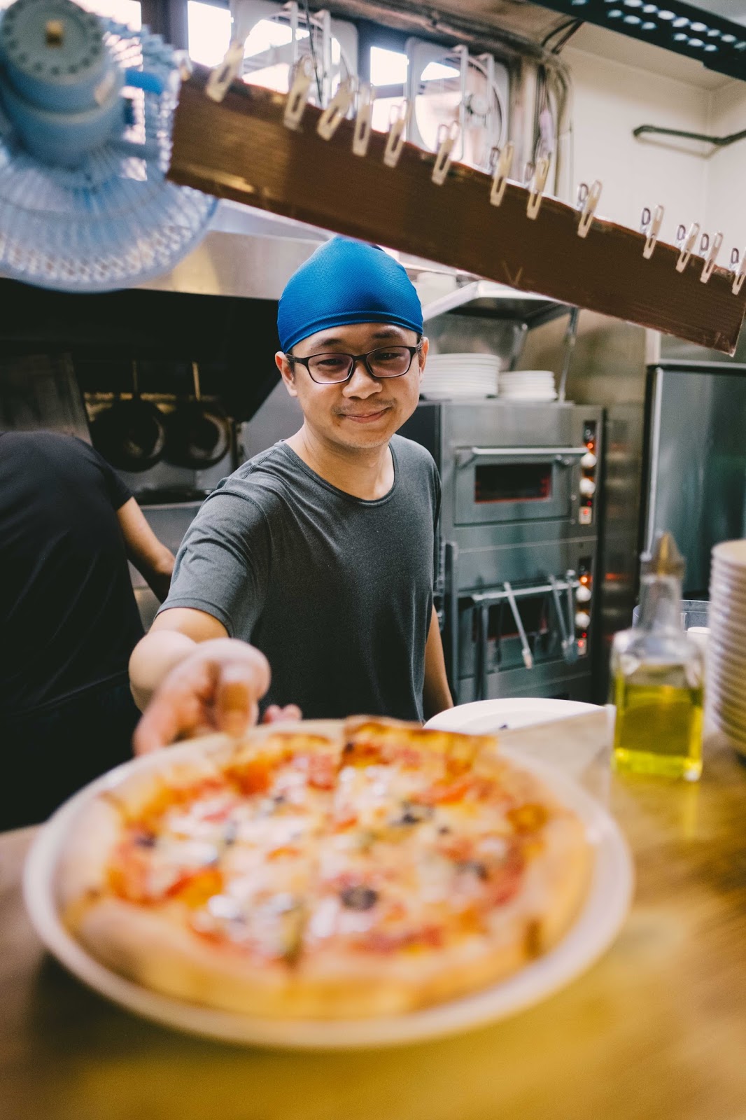薄薄的餅皮上抹上醬汁,放上佐料,放進烤箱並參著職人的熱情把它烘烤成薄皮又牽絲的披薩
