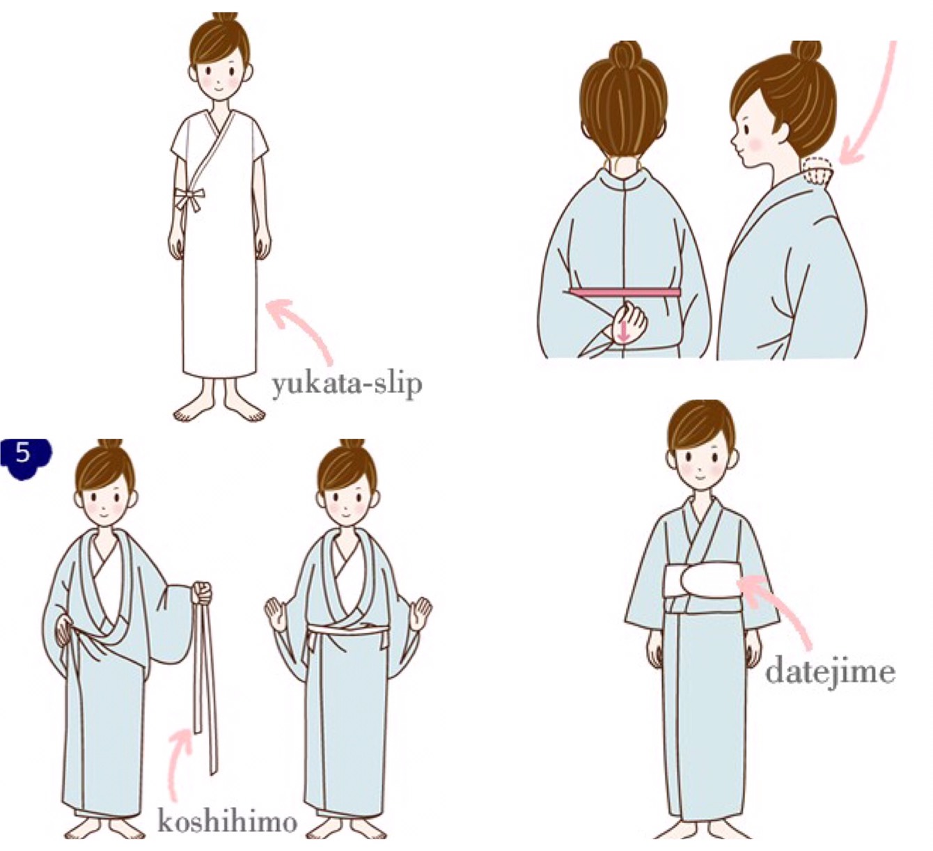 之後穿上浴衣,調整長度,在將⑥datejime 伊達締(是寬度較細的綁帶)固定浴衣