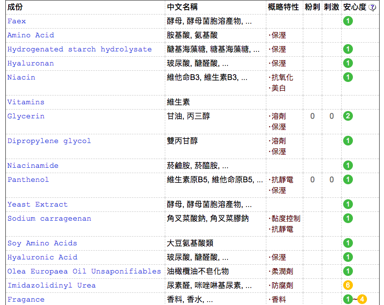FRANCENA柔敏修護保溼精華在全成分的表現,除了防腐劑之外其他都是非常好的