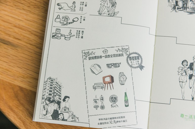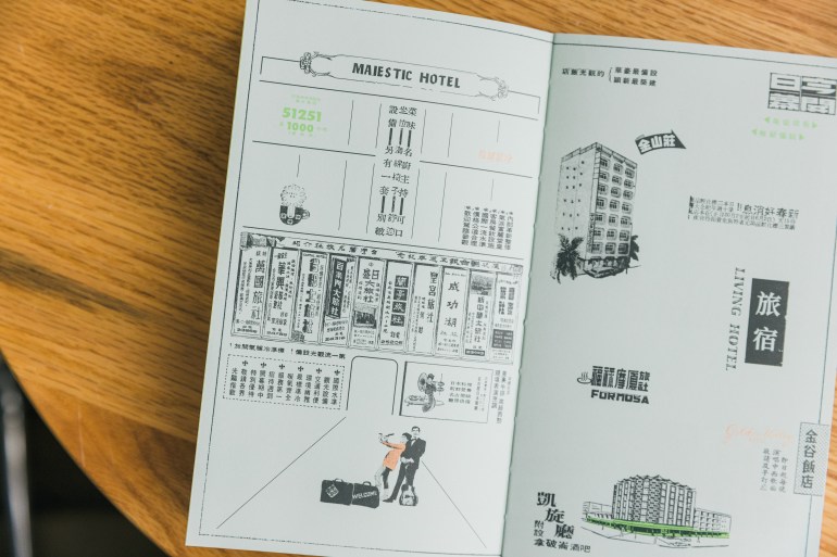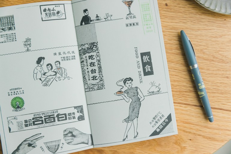 2022老派旅行手帳中共有八個主題,飛行、自由車、飲食、百貨店等等,每個主題都有對應的老報或是舊式廣告,緊接於主題之後的是設計的旅行計畫。從不同的主題回溯1960年代的生活,而我們寫上自己的現在的旅行和生活樣貌,就像在平行時空中與舊時光對話。